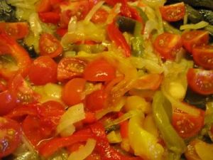 Mondare le cipolle e affettarle in modo sottile. Stufarle in tegame con l'olio bagnandole con l'acqua salata. Lavare e asciugare i peperoni, aprirli e togliere i semi e i filamenti. Tagliare anche questi a falde. Unire i peperoni alla cipolla già stufata e lasciar cuocere per 10 minuti. Aggiungere i pomodori liberati dai semi e spezzettati. Salare e pepare e lasciare sul fuoco per mezz'ora, mescolando.