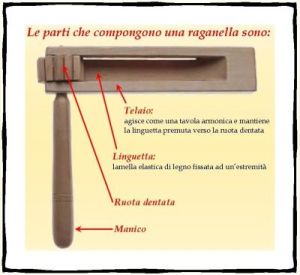 - Italiano: Raganella: strumento musicale di legno costituito da un telaio con una ruota dentata che striscia su una lamella producendo un suono caratteristico, secco e crepitante.