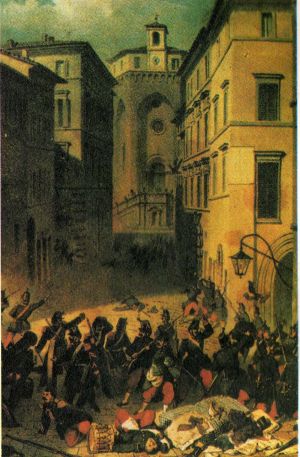 Le truppe del Papa arrivarono a Perugia attraverso Ponte San Giovanni (La prima vittima fu un giovane cantiniere di Ponte San Giovanni, Pietro Cestellini, trucidato inerme) per poi proseguire lungo Via Romana.